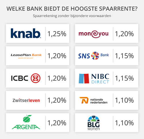 Met 1,25 procent biedt Knab bank op dit moment de hoogste rente. Je kunt bij Knab echter alleen een spaarrekening openen in combinatie met een betaalrekening. Daar zijn, afhankelijk van je pakketkeuze, kosten aan verbonden. De hoogste spaarrentes van dit moment, voor een spaarrekening zonder bijzondere voorwaarden: