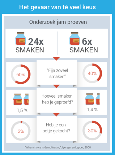 In eerste instantie lijkt meer keuze aantrekkelijker. Bij de kraam van 24 smaken wilden 60% van de passanten proeven. Bij de kraam van 6 smaken daalde dit naar 40%.