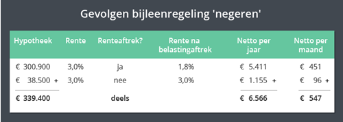 Voor het nieuwe huis dienen ze dan een hypotheek voor het volledige bedrag van € 339.400 te sluiten. In dat geval is over een bedrag van € 300.900 de hypotheekrente fiscaal aftrekbaar. Over het eigenwoningreserve van € 38.500 is de hypotheekrente niet aftrekbaar. Over dat deel van de hypotheek betalen ze dan relatief veel rente.