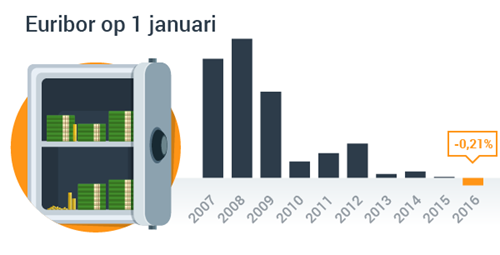 De Euribor is het tarief waartegen banken elkaar onderling geld uitlenen. Omdat banken momenteel moeten betalen om hun geld ergens onder te brengen, is die rente gedaald tot onder het nulpunt; - 0,24 procent inmiddels. Dat tarief geldt voor leningen tussen banken onderling met een looptijd van één maand.
