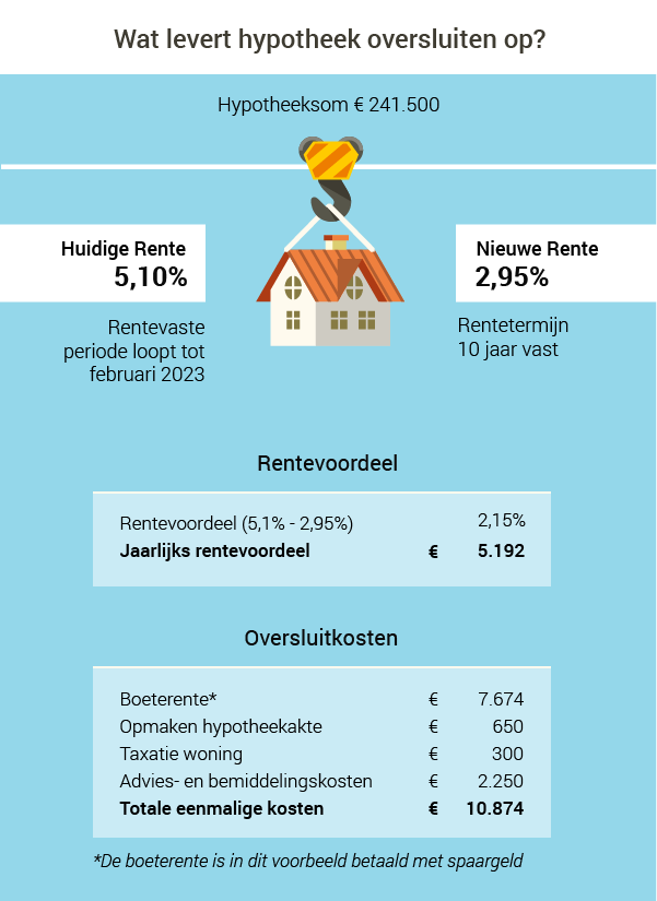 Wat het oversluiten van je hypotheek oplevert, hangt af van jouw hypotheeksituatie. Belangrijk is hoe lang jouw renteafspraken nog lopen. Uiteraard is ook de hoogte van de huidige rente op je hypotheek bepalend. Uit het onderstaande voorbeeld  wordt dit duidelijk, waarbij rekening is gehouden met alle bijkomende kosten.
