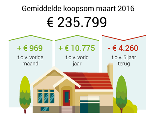 Er werden vorige maand een kwart meer huizen verkocht dan een jaar geleden. Gemiddeld betaal je voor een huis nu € 235.799. Hiermee ben je voor hetzelfde huis nu € 10.775 duurder uit dan in maart 2015.