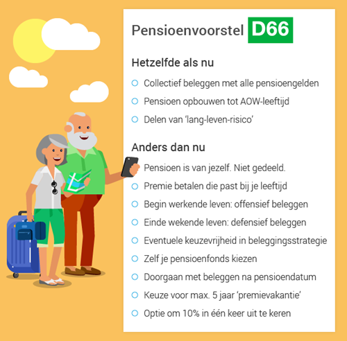 De aanbevelingen komen uit een brief die staatssecretaris Klijnsma schreef aan het kabinet over de ‘waarden’ in het pensioenstelsel. Maar ‘waarden’ zijn uiteraard nog geen invulling. D66 nam daarom het initiatief en schreef een voorstel.