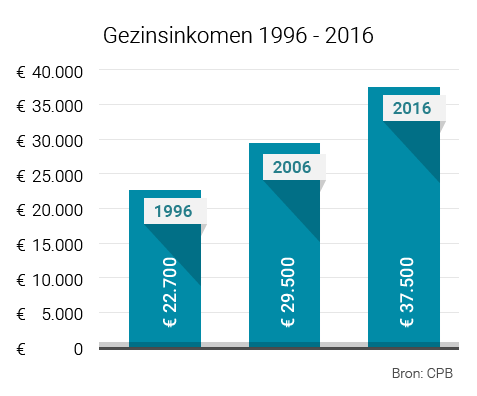 In het voorbeeld is de hypotheekrente fors gestegen. Van 3% naar 6%. Maar in dezelfde periode is je salaris, uitzonderingen daargelaten, ook gestegen. Tussen 1996 en 2016 konden gezinnen rekenen op een gemiddelde salarisstijging van 65%, van € 22.700 naar € 37.500.