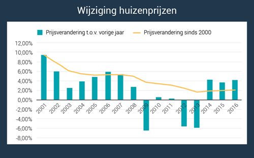 Laten we de huizenmarkt sinds 2000 als uitgangspunt nemen. De dip van de afgelopen jaren lijkt dan nog wel mee te vallen. Tussen 2003 en 2008 steeg de gemiddelde prijs van een huis met ruim € 50.000. Na de piek in 2008 vielen de huizenprijzen echter terug met ruim € 41.000. Een fors bedrag. Maar diezelfde terugval is dus relatief als we naar een langere periode kijken.