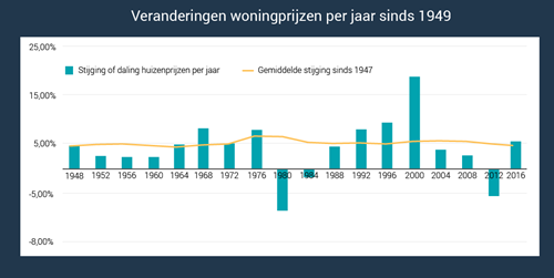 De vraag die kopers zich zouden moeten stellen is: 'tot wanneer blijven de huizenprijzen stijgen?' Want niemand wil uiteindelijk dat kort na zijn of haar aankoop de markt weer instort. Laten we eens kijken naar de ontwikkeling huizenprijzen sinds 1949.