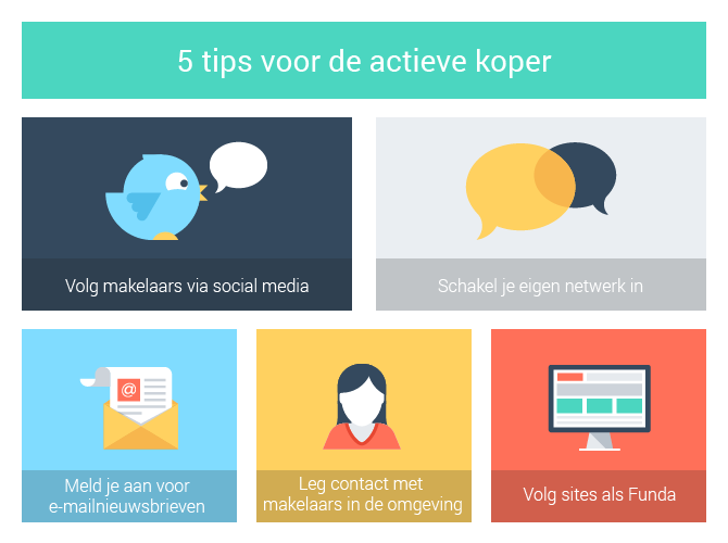 Nog niet alle makelaars werken met social media. Een ‘ouderwets’ bezoekje aan de belangrijkste makelaars in de regio kan dus nog steeds geen kwaad. Een website als Funda in de gaten houden ook niet. De meeste kans heb je immers als je alle kanalen optimaal gebruikt.