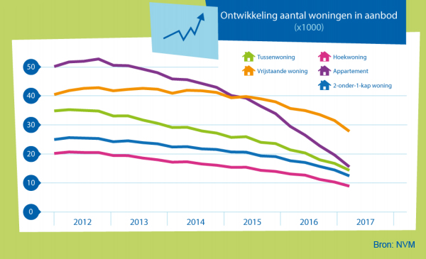 In april stonden er circa 35.000 huizen te koop in de prijsklasse tot € 200.000. Dit zijn er 20.000 minder dan in dezelfde maand een jaar eerder. De afname van betaalbare starterswoningen komt doordat zowel het aantal verkopen als de huizenprijs is gestegen.