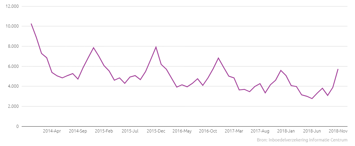 Het aantal woninginbraken daalt al enkele jaren. Het Inboedelverzekering Informatie Centrum (IIC) onderzocht politiecijfers van de afgelopen vijf jaar. Van januari 2017 tot en met november 2018 is er 46.915 keer ingebroken. Dit aantal ligt tien procent lager dan in dezelfde periode vorig jaar. Ondanks de daling blijft eind van het jaar een forse piek zichtbaar. Dit jaar is ook november erg ‘in trek’.