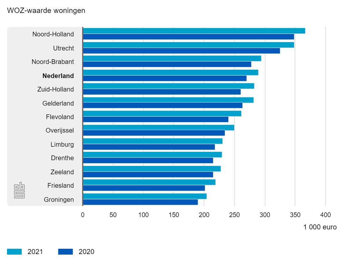 In de provincie Flevoland steeg de gemiddelde woningwaarde het sterkst (8,7%) met een gemiddelde waarde van €262.000. Deze waarde ligt wel lager dan het landelijk gemiddelde van €290.000. Alleen in de provincies Noord-Holland, Utrecht en Noord-Brabant ligt de gemiddelde WOZ-waarde hoger dan het landelijke gemiddelde. Opvallend is dat de provincie Noord-Holland de laagste gemiddelde stijging kende (5,2%), maar toch de hoogste gemiddelde WOZ-waarde heeft.