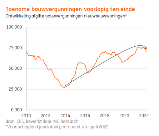 De kabinetsdoelstelling om jaarlijks 100.000 woningen te bouwen blijft nog ver uit zicht. ING Research stelt dat het aantal gerealiseerde nieuwbouwwoningen in 2022 niet stijgt en uitkomt op circa 71.000 en volgend jaar daalt tot 70.000. Het bouwen van nieuwbouwwoningen blijft goede handel voor projectontwikkelaars, ondanks de gestegen bouwkosten.