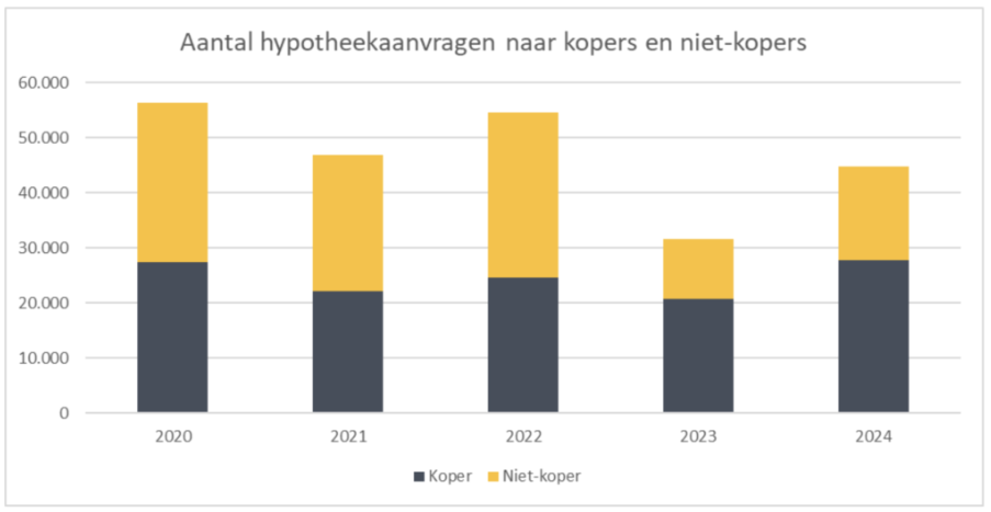 Uitgaande van alle hypotheekaanvragen in april over de afgelopen vijf jaar is er duidelijke opleving van de markt te zien ten opzichte van 2023. Toch is het niveau van 2022 en daarvoor nog niet bereikt. Dit komt vooral door de gestegen rente in het afgelopen jaar. Het eerdere enthousiasme voor het oversluiten van hypotheken verdween hierdoor als sneeuw voor de zon. De groep woningkoper is daarentegen wel flink actief en nadert het het recordjaar 2020, met ongeveer 27.000 aanvragen.